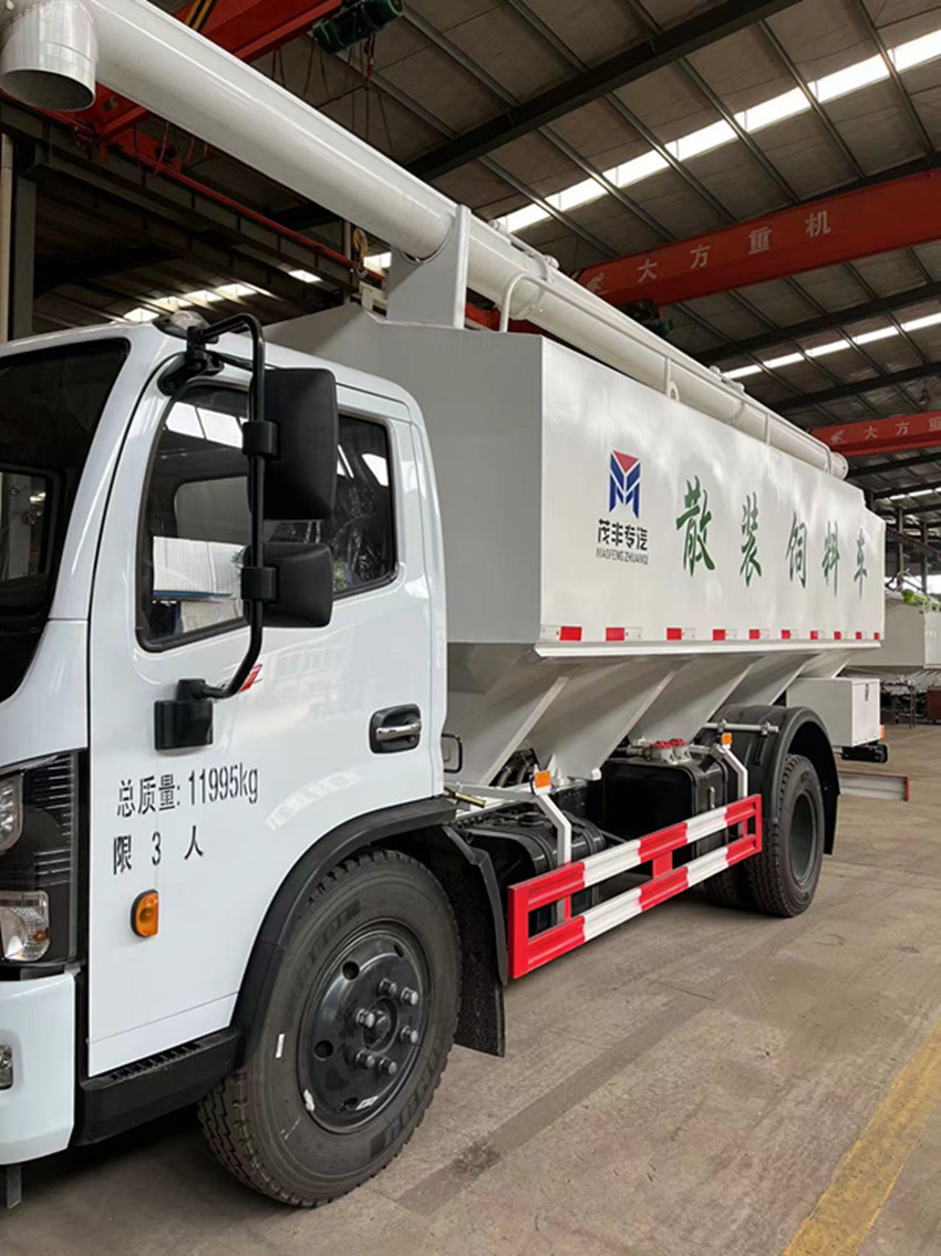 散裝飼料運(yùn)輸車(chē),散裝飼料車(chē)的飼料罐架設(shè)在卡車(chē)的底盤(pán)上,罐頂開(kāi)有進(jìn)料口.頂部的一根螺旋輸送卸料管(俗稱(chēng)卸料絞龍)則可自由回轉(zhuǎn)和抬升,抬升的仰角可達(dá)60度。運(yùn)輸時(shí),頂部的螺旋管平臥在罐頂;卸料時(shí)則抬起,使管端的出料口與畜禽飼養(yǎng)場(chǎng)貯料罐頂部的進(jìn)料門(mén)相接,駕駛室內(nèi)裝有操縱裝置(操縱裝置也可裝置在罐體尾部),卸料時(shí)通過(guò)車(chē)底的動(dòng)力輸出軸和減速器來(lái)驅(qū)動(dòng)螺旋,以完成卸料。
